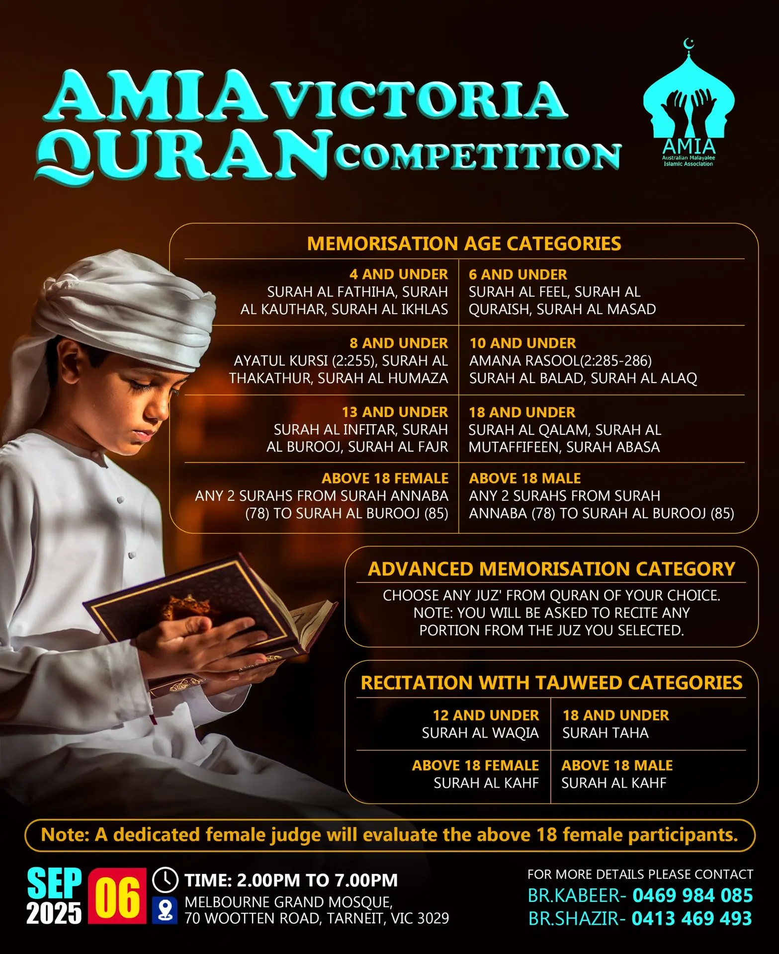AMIA Victoria is excited to announce the Quran Competition, insha Allah. For the first time, this year’s Quran Competition is open to both adults and children.