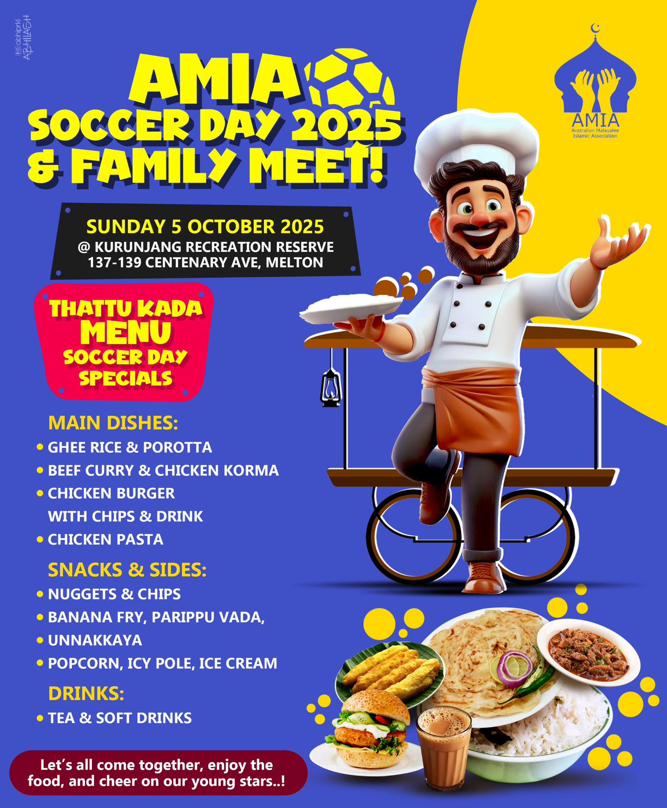 AMIA Victoria is pleased to invite you with family for the upcoming Soccer Day & Family Meet on Sunday, 5th October, 2025, insha Allah.